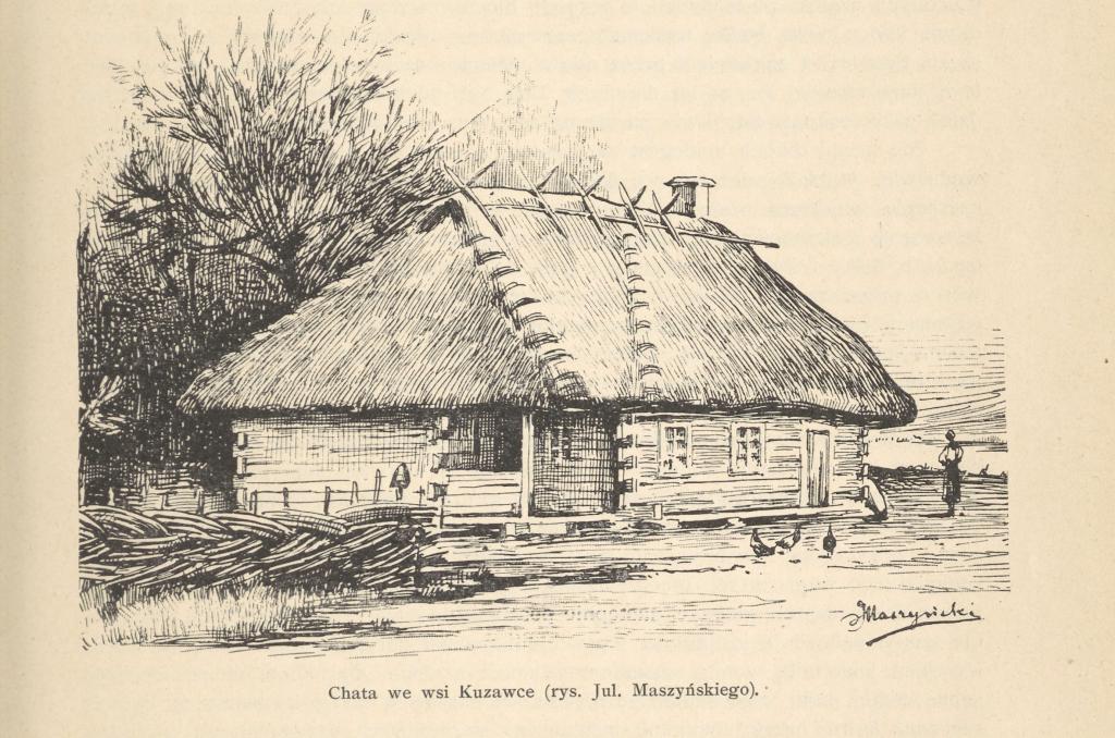 Po tych perypetiach wieczorem dotarli zaledwie do Kuzawki. Tu musieli zejść na ląd aby znaleźć nocleg. Jedna z mieszkanek wskazała im pobliskie gospodarstwo, gdzie przespali się w stodole. Oddajmy znów głos badaczowi: „Ja robiłem notatki, pan Julian tymczasem odrysował niebieloną chatę naszego gazdy z jej słomianą, o dużych okapach strzechą i narożnem podsieniem wspartym na słupie węgielnym. Ogródek otoczony był płotem plecionym porządnie z łozy, jak się plotą warkocze. W chacie na stole leżał bochen chleba białym obrusem domowej roboty przysłonięty, jako zawsze gotowy posiłek dla gościa lub ubogiego, który w progi domu wstępuje. Dawny to i piękny zwyczaj gościnności słowiańskiej.”. Z pobytu w Kuzawce pozostał więc opis Z. Glogera oraz rysunek J. Maszyńskiego. Warto wspomnieć, że szkic posłużył jako ilustracja nie tylko do książki „Dolinami rzek. Opis podróży wzdłuż Niemna, Wisły, Bugu i Biebrzy”, ale także do najwybitniejszego dzieła tego etnografa czyli „Encyklopedii Staropolskiej”.